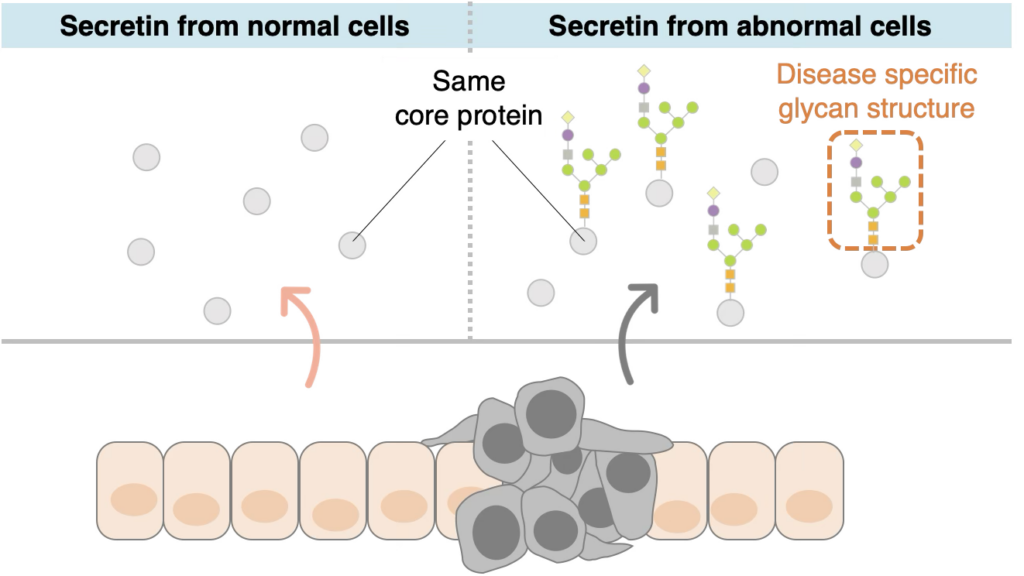 我々がターゲットとしている「糖鎖」は、生物における第4の生命鎖であり、細胞・臓器や個人の違いを提示する分子です。さらに同じタンパク質であっても、感染症や癌など病気の状態に応じて糖鎖修飾が変化することが明らかとなり、“質的な変化”を検出できる疾患特異的な糖鎖バイオマーカーは、個別化医療(プレシジョン・メディスン)の観点からも非常に重要とされています。
