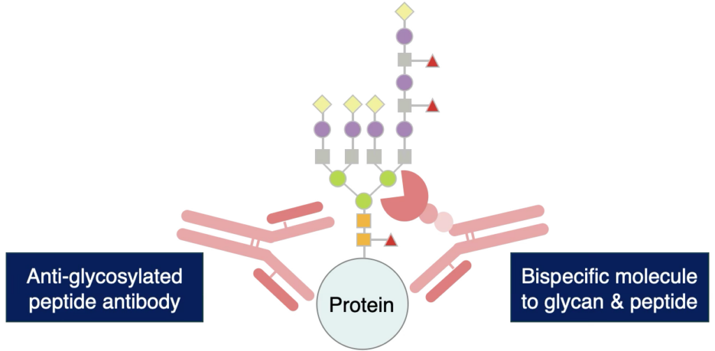 通常、 N-グリコシル化された治療標的分子に対する抗体は取得することが難しいとされています。当社は、これまでに行ってきた糖鎖研究のノウハウを生かして、高度に分岐したN-グリコシル化治療標的に対する特異性の高い抗体/抗体レクチンキメラの開発を可能とする、独自のプラットフォーム “Glea™ platform”を確立しました。